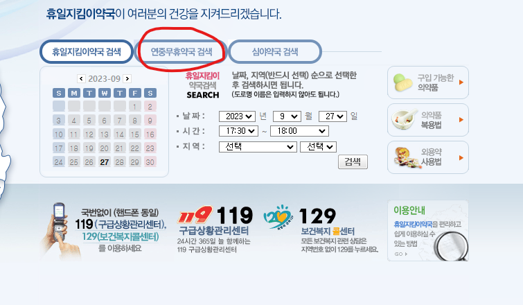 링크로 들어가신 후   연중무휴약국 검색을 눌러주세요. 그 후 본인이 거주하고 있는 시.도와 구. 군을 선택하신 후 검색을 눌러주세요. 검색을 누르시면 문을 열고 있는 약국이 나오게 됩니다.