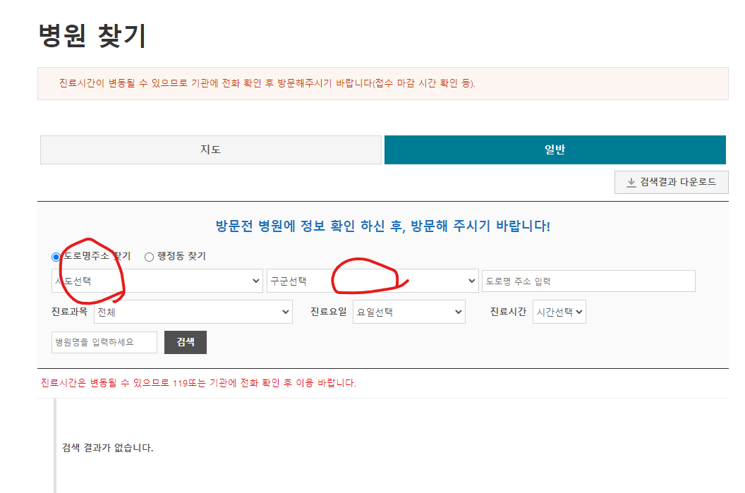 링크로 들어가신 다음 본인이 거주하고 있는 시. 도와 구. 군을 선택하신 후 검색을 눌러주세요.
