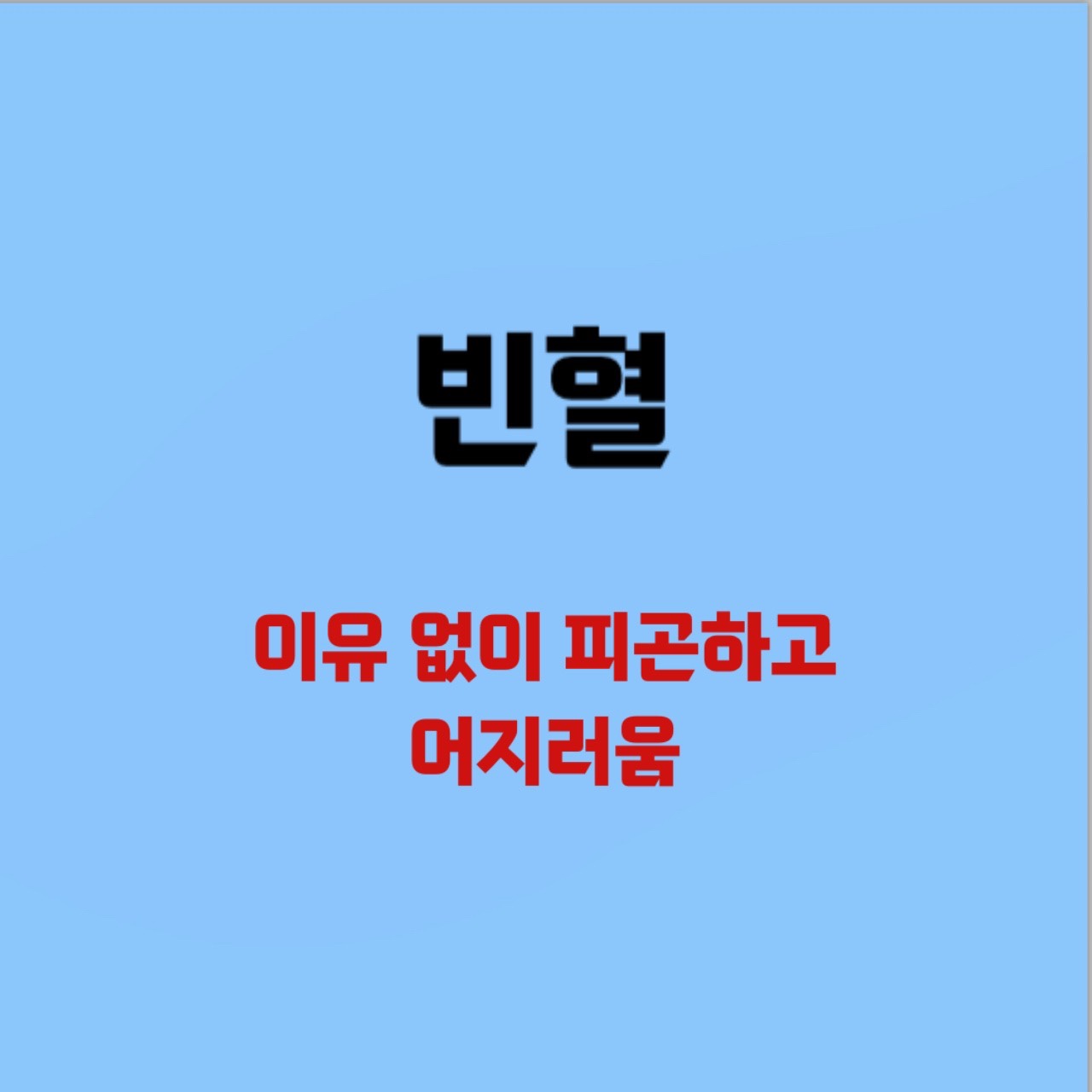 적혈구의 숫자나 적혈구내의 혈색소가 정상수치보다 낮아져 대사에 필요한 산소를 충분히 공급하지 못해 조직의 저 산소증을 유발하는 것을 빈혈이라고 합니다.